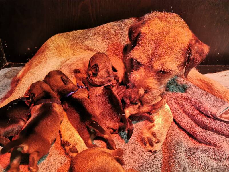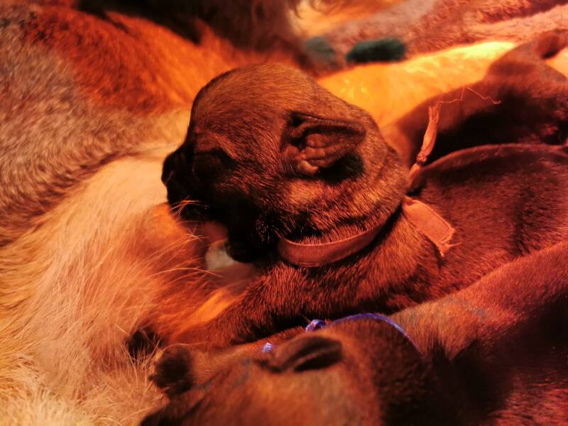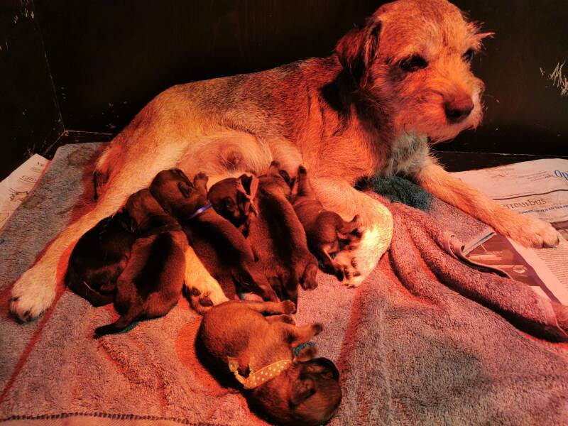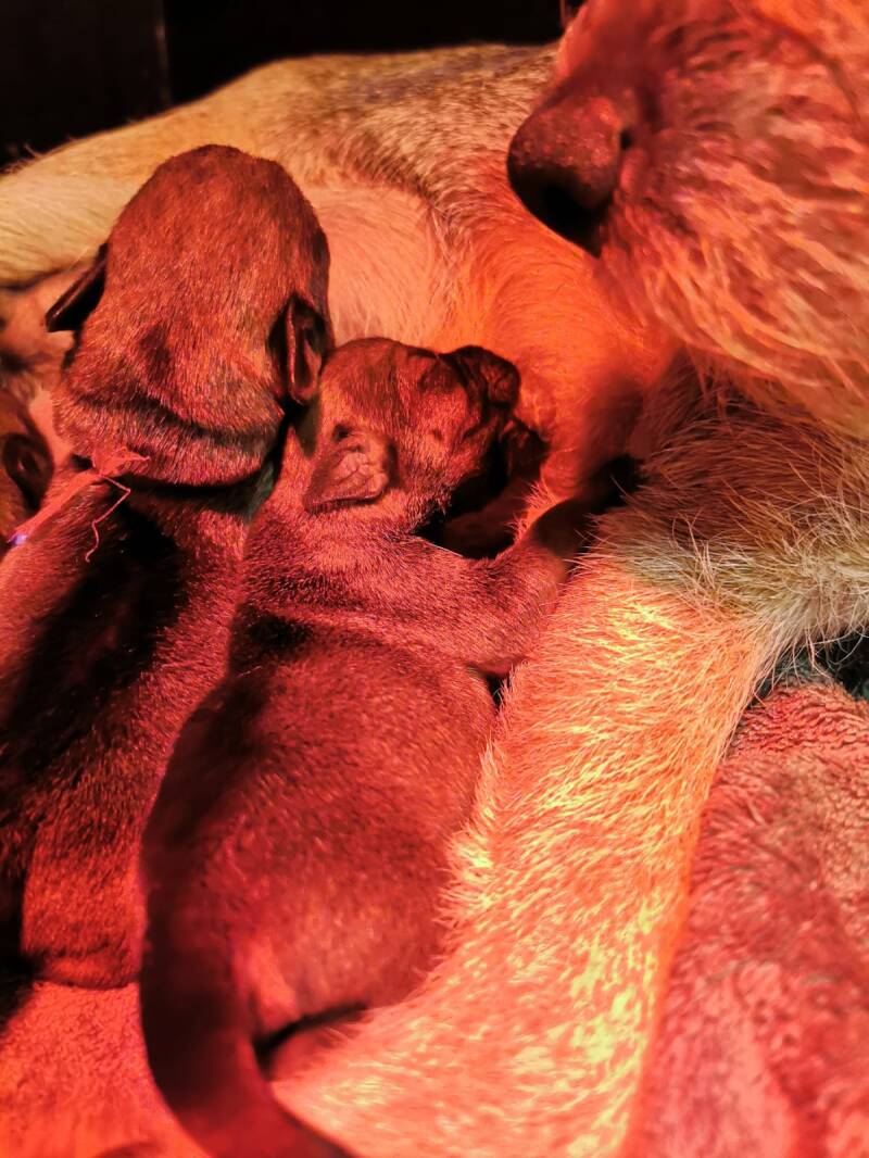 Vandaag zijn de pups alweer 5 dagen oud. Ze worden met de dag actiever. Door het rode licht van de warmte lamp zijn de kleuren van de bandjes niet zo goed te zien maar hieronder een overzicht van de stamboomnamen + bandjes van de pups.