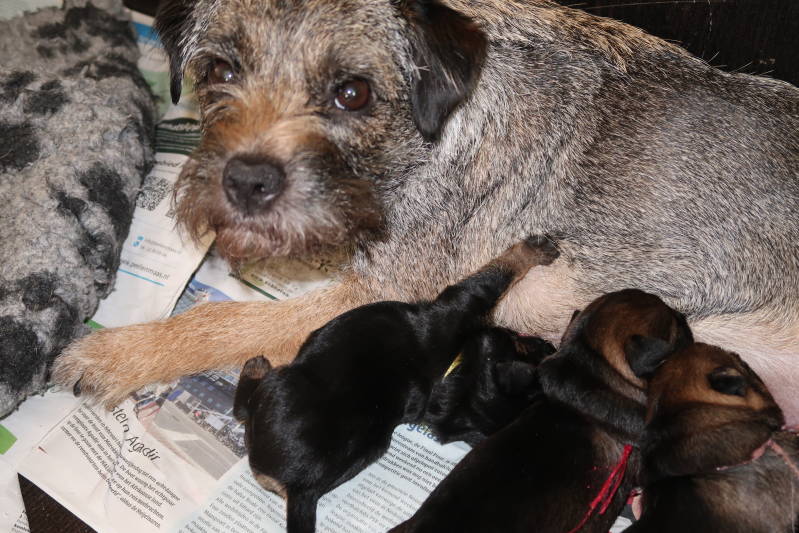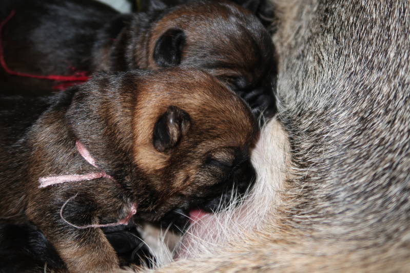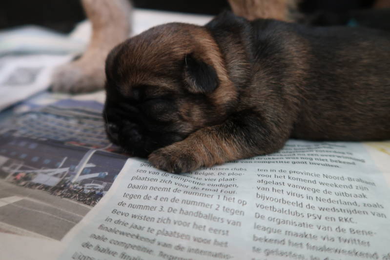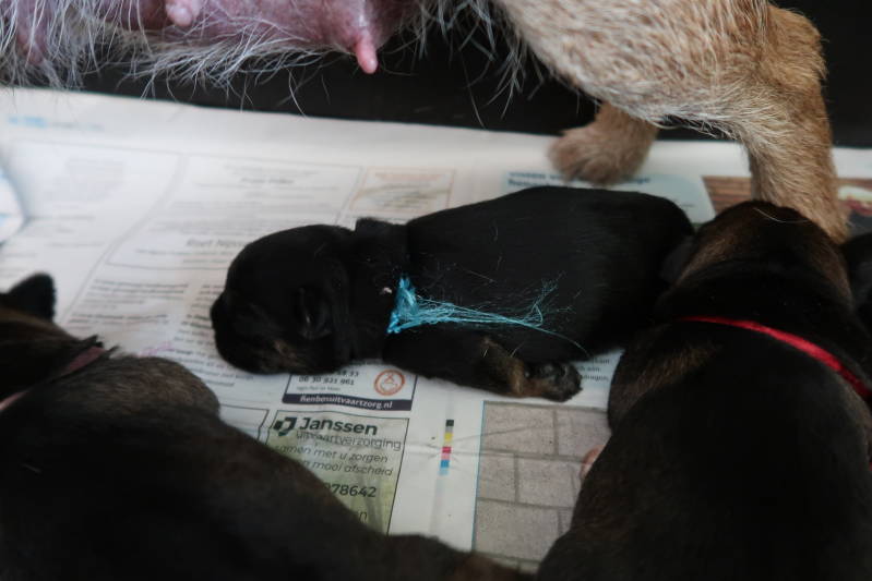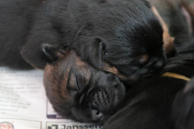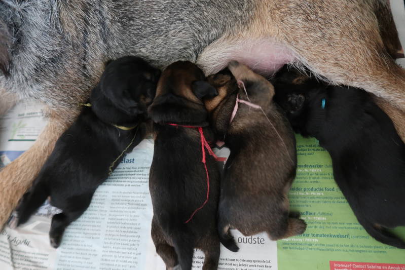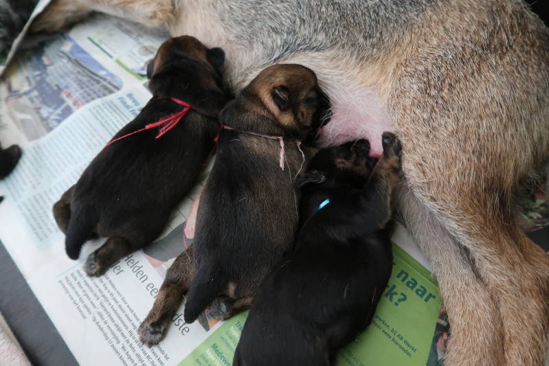 De pups doen het heel erg goed, ze groeien ontzettend snel en over een aantal dagen gaan de oogjes en oortjes open. Ze zijn heel erg lief en tot nu toe heb ik er weinig werk aan gehad. Bobbie verzorgt de pups tot in de puntjes! Ze is een geweldige moeder.